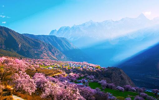 在这里您可以观赏到漫山遍野的桃花,犹如置身在桃花林海中,百年野生桃树林掩映着嫩绿的青稞田,圣洁的雪山倒影在明丽清澈的尼洋河中。
