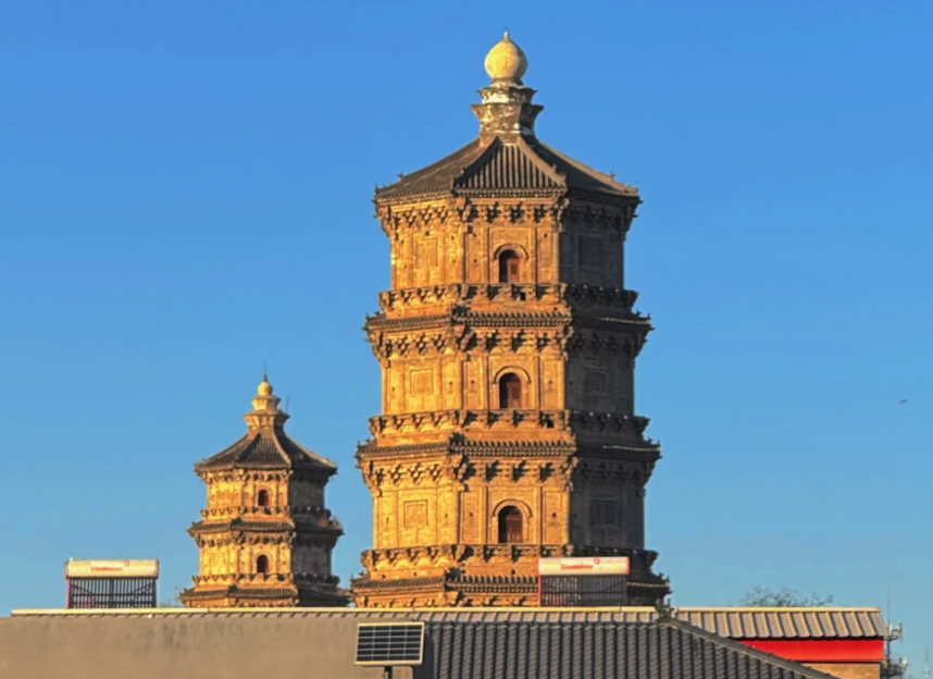 南塔智度寺塔:为五层八角仿木构砖塔,建于砖雕须弥基座上,设五铺作平座斗棋。塔身各层正面辟券门、斜面设破子棂盲窗,斗棋下设阑额及普拍枋,其上覆瓦顶。每层每面设补间铺作一朵。