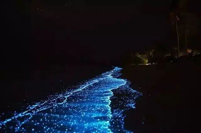 一波波蓝色涟漪随浪袭来,犹如海洋里的极光,如梦似幻。无数幽蓝的光芒在我们脚下步步“盛开”,宛如漫步在无尽的星空里,美得令人陶醉。那是藻类用短暂的几秒生命绽放出的光,如此的可遇而不可求!